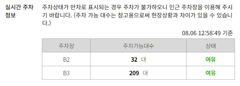 - 주차 요금: 5분당 170원 / 1시간 2,040원 / 1일 48,960원